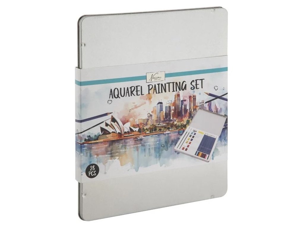 Balení obsahuje 12ks zářivých barev v pánvičkách, 12ks akvarelových pastelek, 1ks kulatého štětce, 1ks plochého štětce, 1ks kovového ořezávátka a 1ks houbičky.