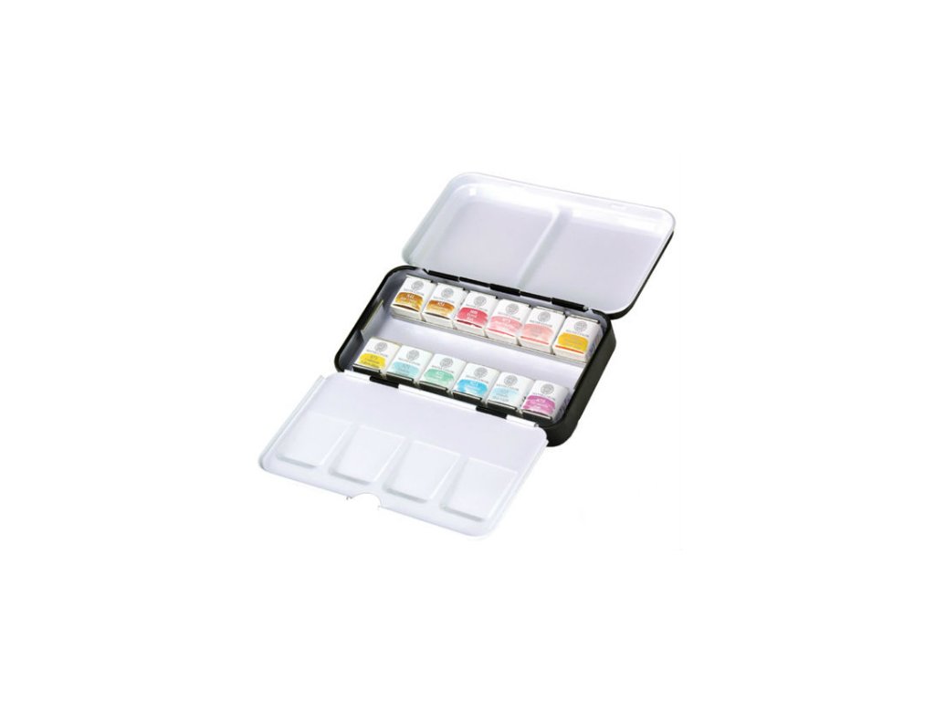Po naředění jsou barvy transparentní a stálobarevné. Sada barev v plechové krabičce obsahuje 12 pastelových odstínů akvarelových barev v půlpánvičkách (malých plastových kostkách) o velikosti 20x16x10mm.