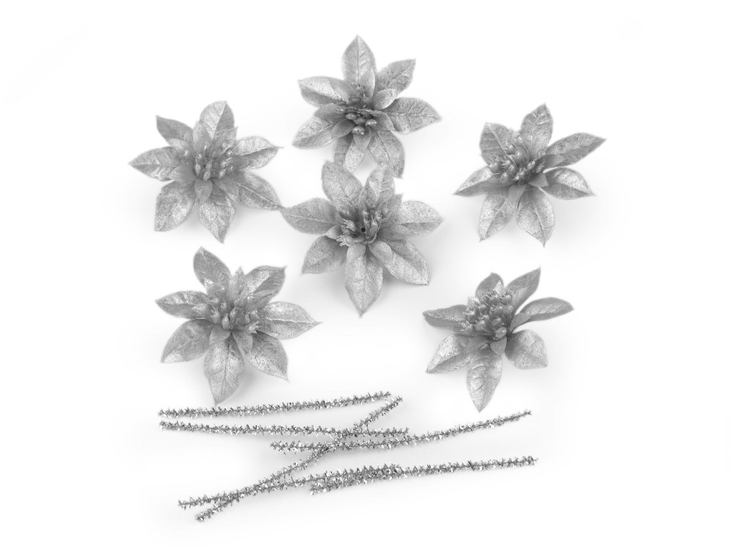 Metalické vánoční hvězdy jsou poutavým detailem sváteční výzdoby. V balení najdete chlupaté drátky, díky kterým můžete květy připevnit do věnců, různých vánočních aranžmá, na stromeček, na dárky apod.