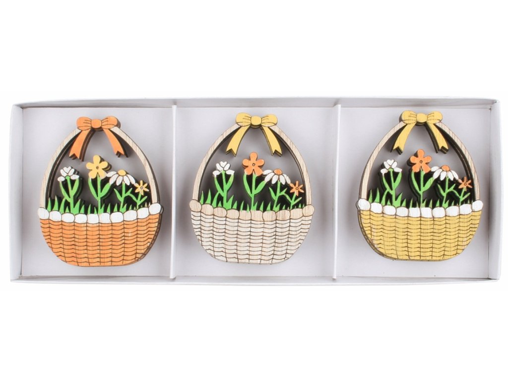 Malé dřevěné košíčky s květinami s lepicím bodem na zadní straně jsou stylovou a praktickou dekorací pro jarní i sezónní výzdobu. Každý košík je vyřezán ze dřeva a zdoben motivy květin, což jim dodává rustikální a hravý vzhled vhodný do interiérů i aranžmá.