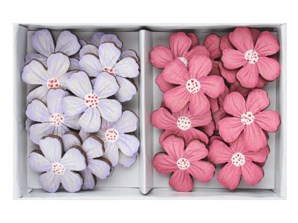 Kytky dřevěné růžové a fialové 2,5 x 2,5 cm s lepíkem, 24 ks