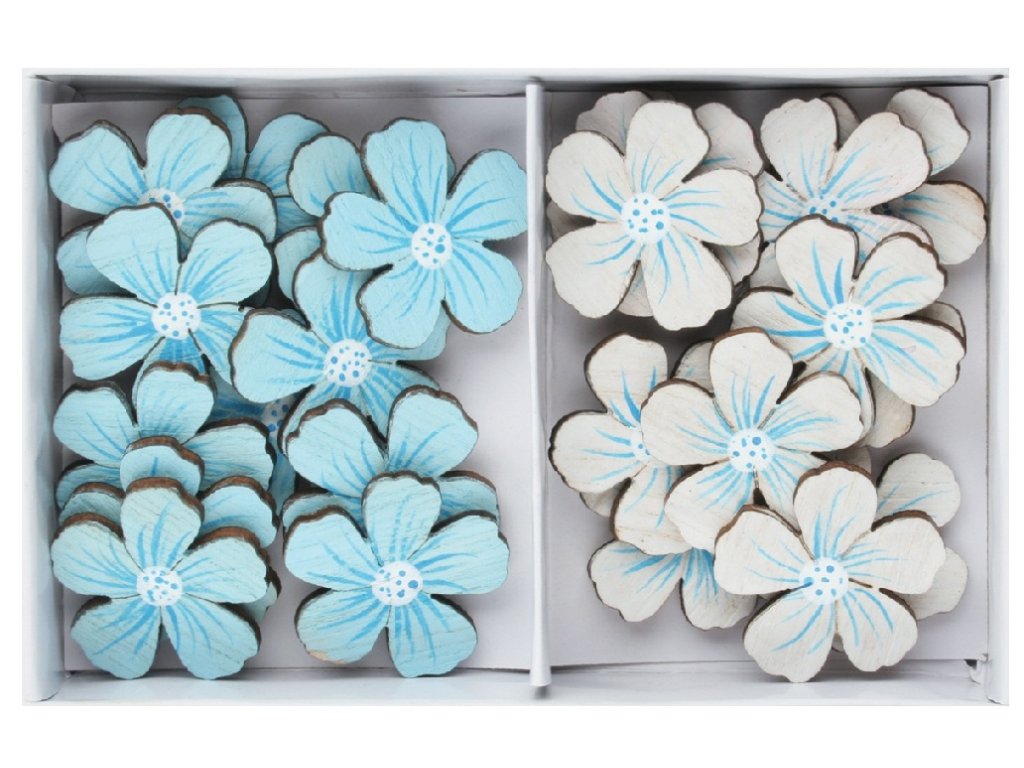 Kytky dřevěné světle modré a bílé 2,5 x 2,5 cm s lepíkem, 24 ks