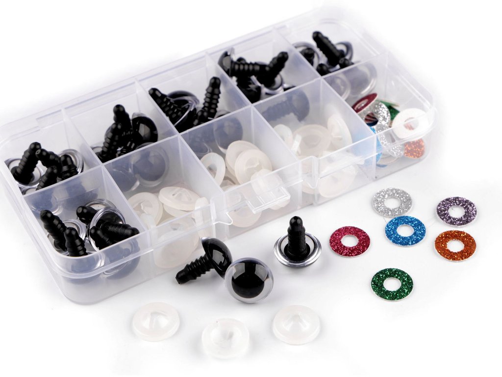 Krabička obsahuje: 15 párů očí, celkem tedy sada obsahuje 30 ks očí. V sadě je 8 barev glitrových duhovek. Nacvakávací pojistky jsou zvlášť v sáčku.