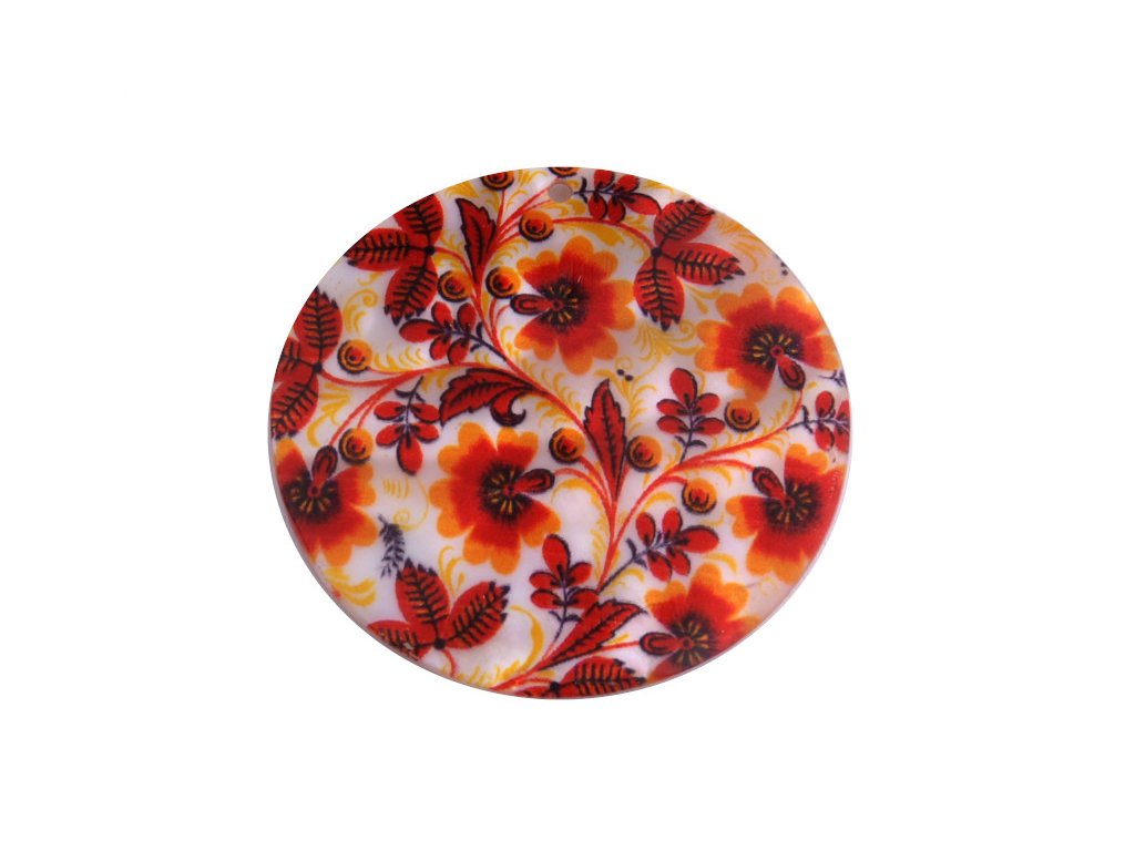 Perleťové placky potištěné, průměr 5cm. Vytvořeno ze silnější vrstvy perletě, tloušťka nemusí být na celé placce stejná, můžou se objevit přírodní zbarvení dohněda a také nerovnosti.