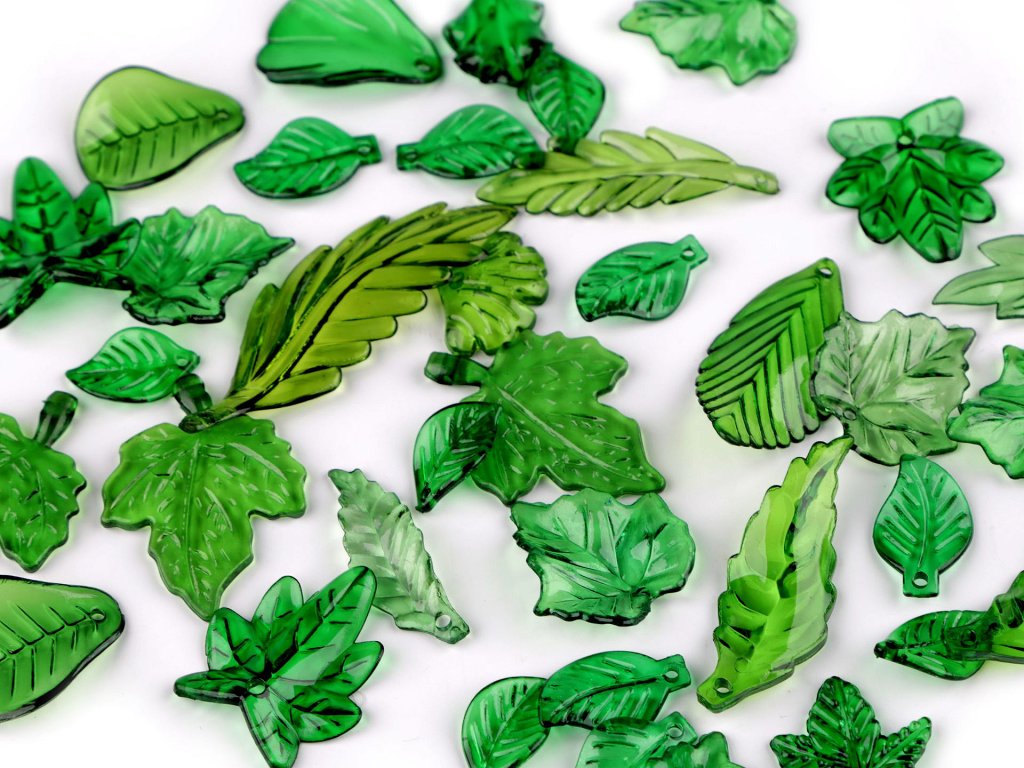 Plastové korálky lístečky mix tvarů i velikostí zelené tm. 20g