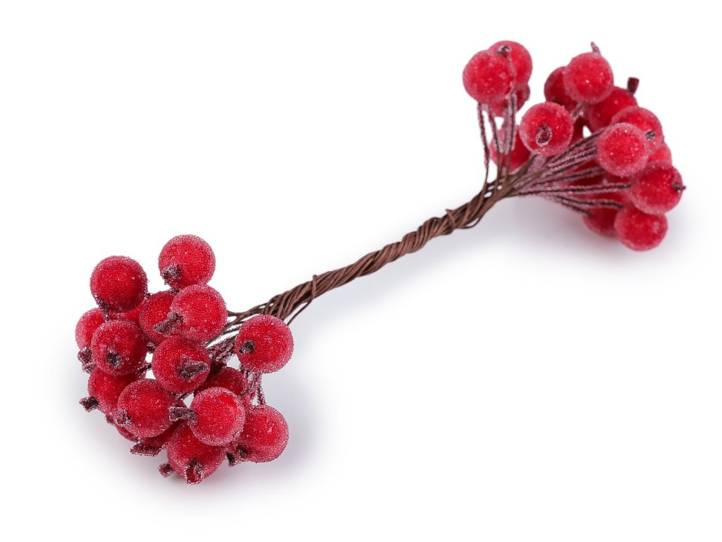 Dekorační bobule jsou zpestřeny drobnými transparentními kuličkami z plastu, které vytvářejí dojem námrazy. Díky drátku se dají ohýbat. Na každém konci drátku je jedna bobulka.