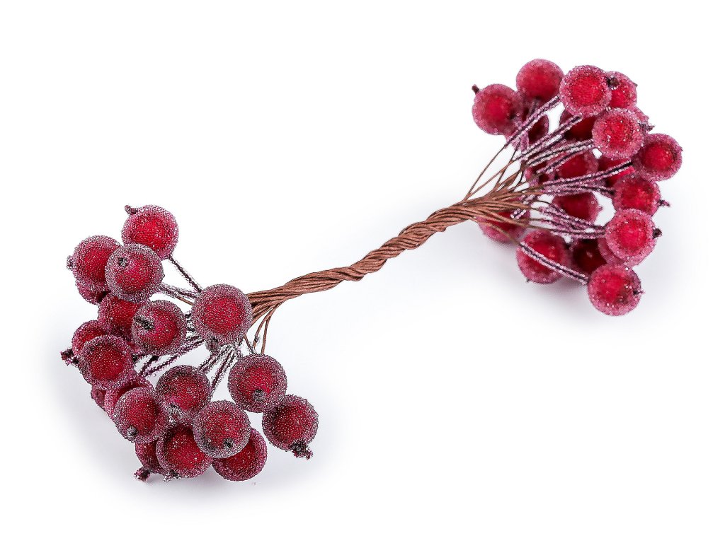 Dekorační bobule jsou zpestřeny drobnými transparentními kuličkami z plastu, které vytvářejí dojem námrazy. Díky drátku se dají ohýbat. Na každém konci drátku je jedna bobulka.