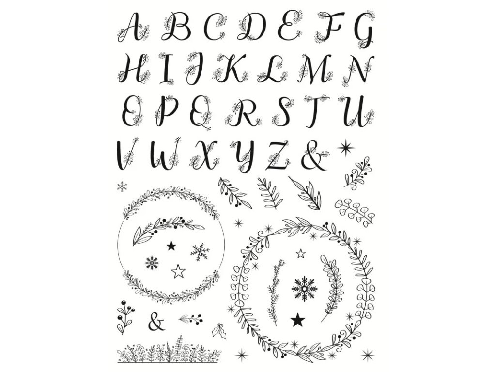 Sada gumových razítek na pěnové hmotě s kvalitní hlubokou texturou má motivy velkých písmen abecedy a vánočních větviček.