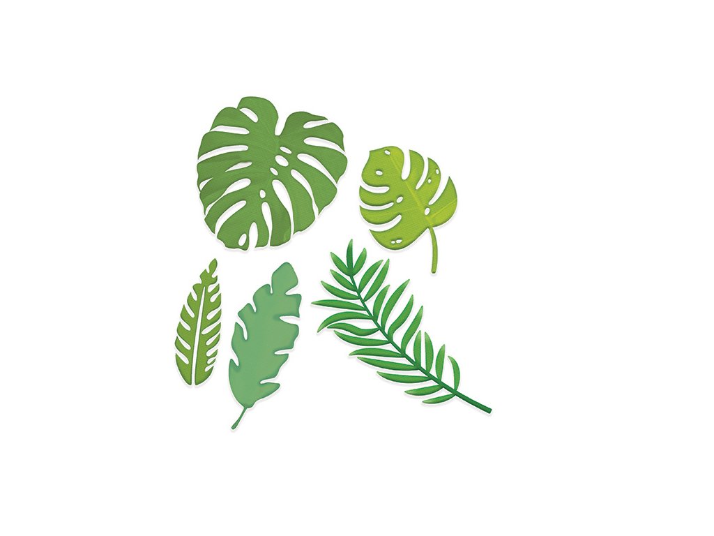 Sada vykrajovátek obsahující rostlinné motivy se stylizovanými exotickými listy m.in. monstery nebo palmy pro vytváření jedinečných prací z papíru, lepenky a pěny.