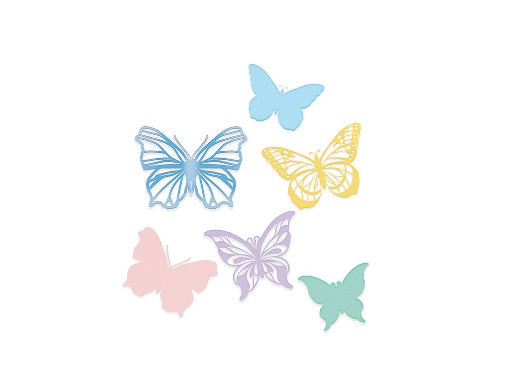 Sada vykrajovátek obsahující motivy nádherných motýlů, včetně těch prolamovaných, pro vytváření jedinečných prací z papíru, lepenky a pěny.